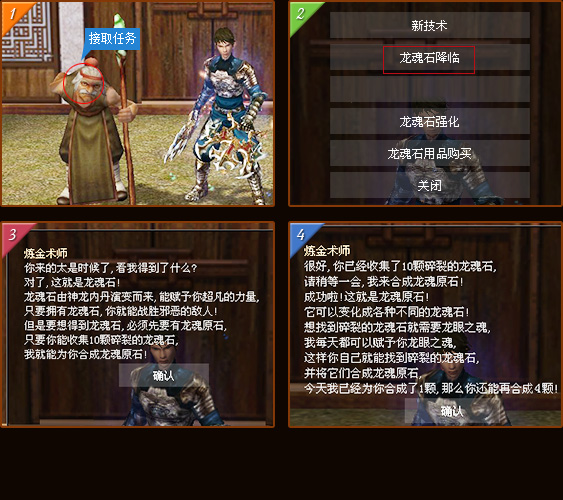 当角色等级达到30级后,可以在NPC“炼金术师”处接取“龙魂石降临”任务,完成后可获得一颗“龙魂原石”,并正式开启龙魂石功能。此后,再次击杀相应等级的怪物后,都会有几率掉落“碎裂的龙魂石”,每收集齐10个“碎裂的龙魂石”,系统就会自动兑换为一颗“龙魂原石”。